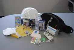 各営業所ごとに常勤者全員に、ヘルメットや非常食等の防災グッズを配備しています。