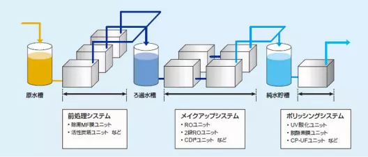 ボイラー給水・飲料水用原水等の一般純水や電子産業向け超純水の製造プロセスとして、従来から使用されてきた「イオン交換式純水装置」は、再生薬品の使用・再生廃液の処理・メンテナンス性等の面から、現在ROユニットを中心とした「膜処理」に置き換えられています。