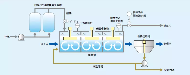 従来の活性汚泥プロセスでは酸素源に空気を利用しますが、高濃度酸素を供給することにより汚泥の活性が高まり、難分解性の成分や高濃度BOD等に対し高い処理能力を誇ります。